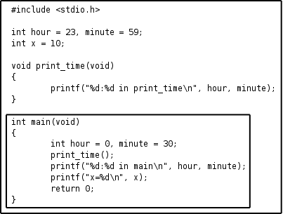 printf("%d:%d in main\n", hour, minute);
